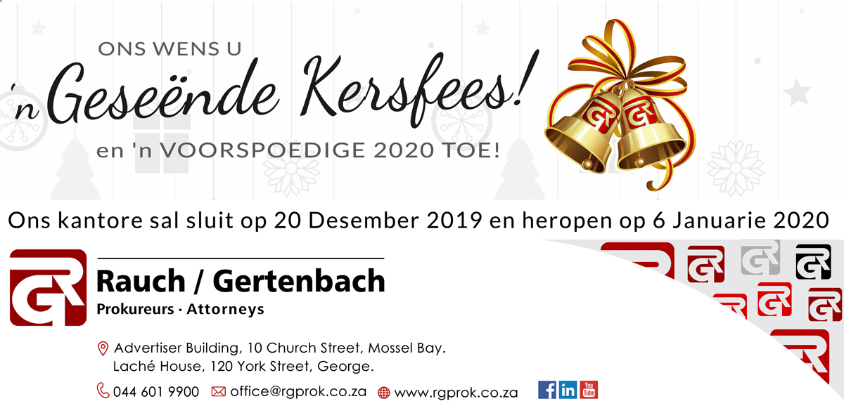 Vir meer inligting kontak gerus enige van ons Aktebesorgers, Jaco Fourie, Maryke Landman of Paul Delport by office@rgprok.com of 044 601 9900. www.rgprok.co.za